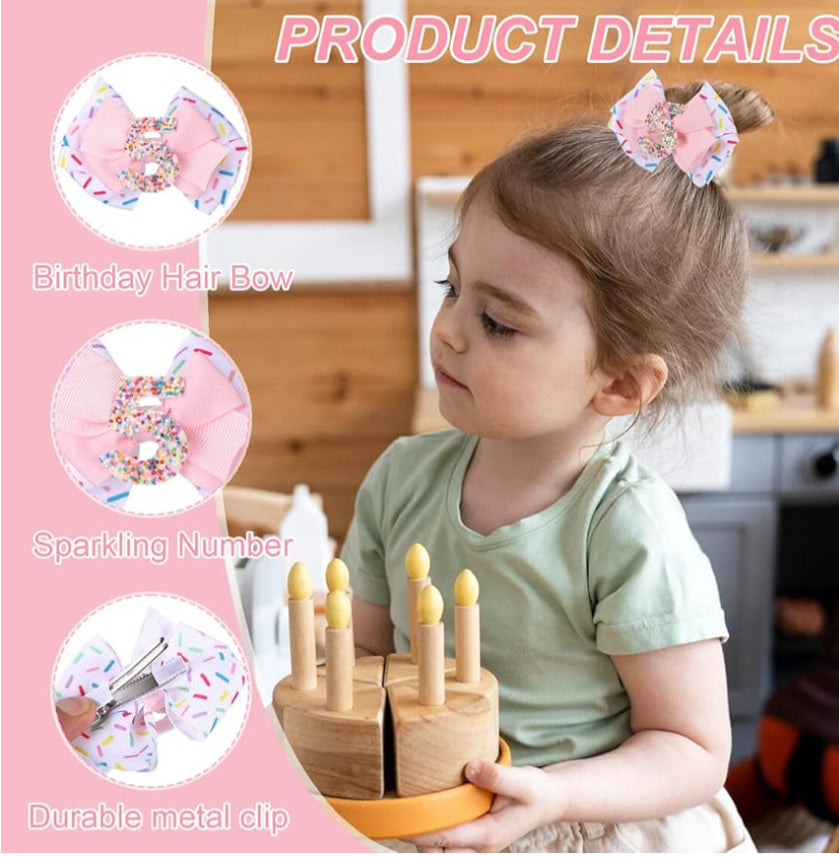Adorable pink sprinkle bow hair clips perfect for adding a fun touch to any outfit. Features a playful design with a colorful number 5 embellishment. Ideal for birthdays and special occasions.
