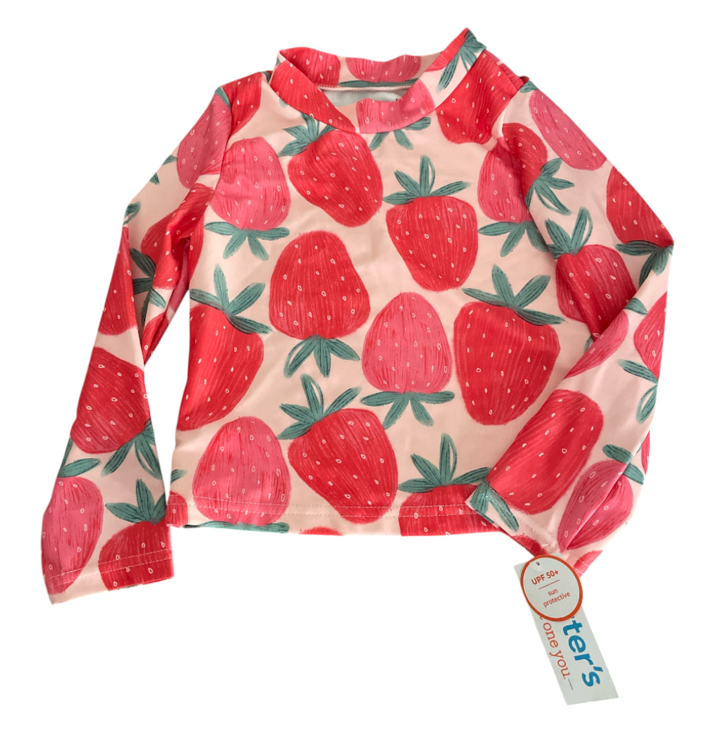 Description: 4 items/ strawberry long sleeve swim style top/ cotton elastic waist pants with owls in pink & blue on them/ pink cotton tee & pants set with cherries on it/ gray cotton shorts with elastic drawstring waist (Cat & Jack)