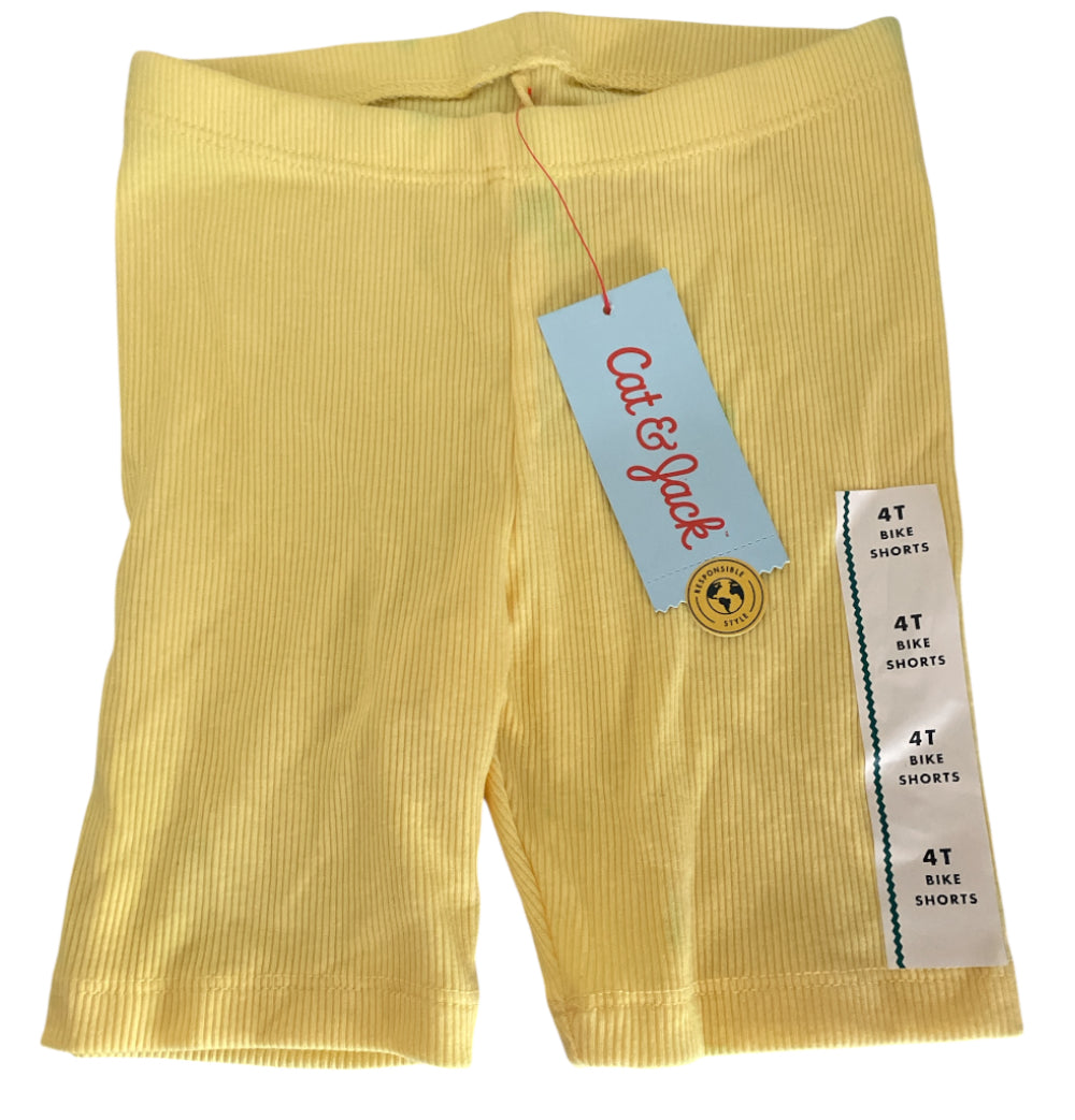 Description: 4 items/ light green long cotton top with rainbows on it/ cotton elastic waist pants with rainbows in pink, purple & blue on them/ yellow ribbed biker shorts