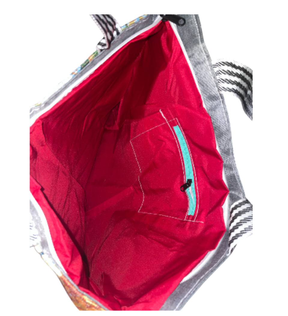 Description: color | thick | canvas | tote | inner lining in red | zipper pocket on the in side | zipper closure
