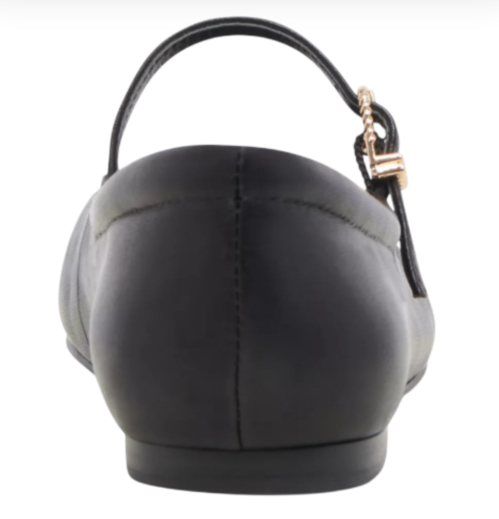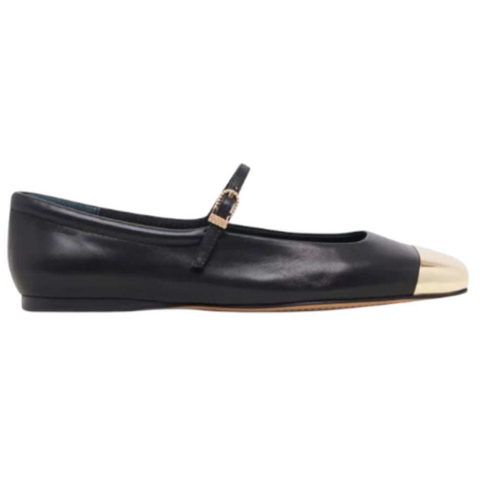 Description: gold toe cap | Buckle closure | leather man made | ballet flat | square toe