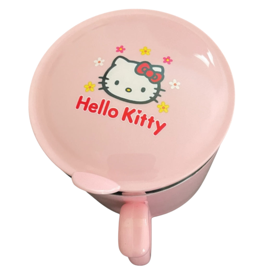 Description: Hello Kitty/ pink color scheme/ stainless steel on the inside/ PP (polypropylene) on the outside for insulation/ keeps beverages hot or cold/ has a lid/ suitable for travel use at home or work.