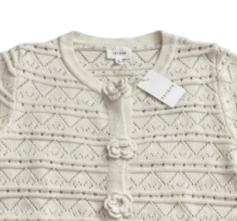 Condition: NEW With Tags Description: beautiful flower buttons | Stretchy pointelle knit | Semi-cropped length | flower button details | Ribbed banded trim | Unlined | 100% Acrylic | bust 24” | length 26”