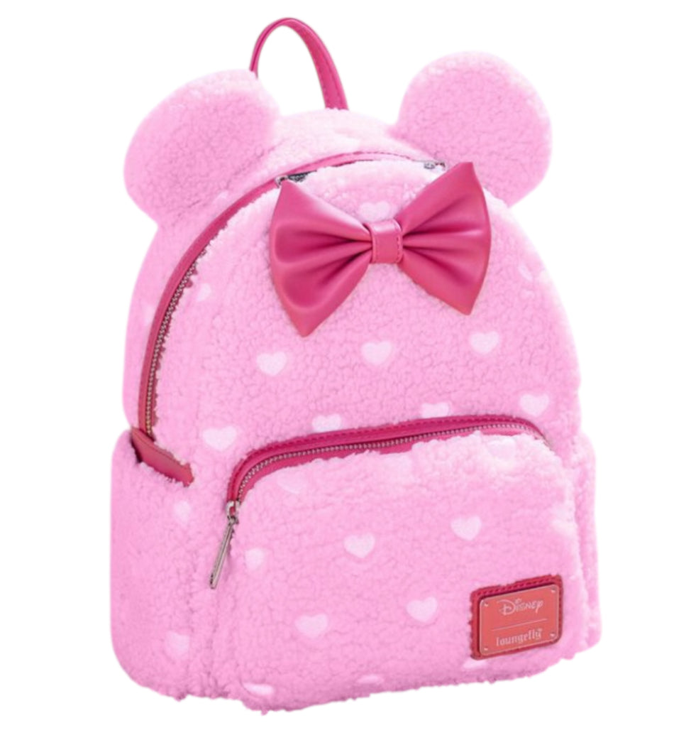 Description: exclusive mini backpack | bag is covered in soft pink sherpa material with white hearts all over | 3D Minnie Mouse ears | 3D bow | the bag is strawberry scented | Sherpa mini backpack with faux leather (polyurethane) trim | Adjustable shoulder straps | Sturdy top handle | Front zipped pocket | 3D bow | Scented | Applique, embroidered, and printed detail