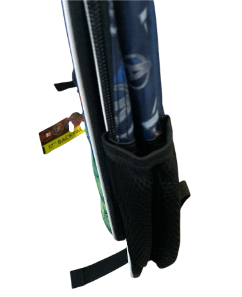 Description: adjustable padded shoulder straps | a top loop for hanging | 2 side pockets | double zipper closure | hit the front and it lights up! | 17”