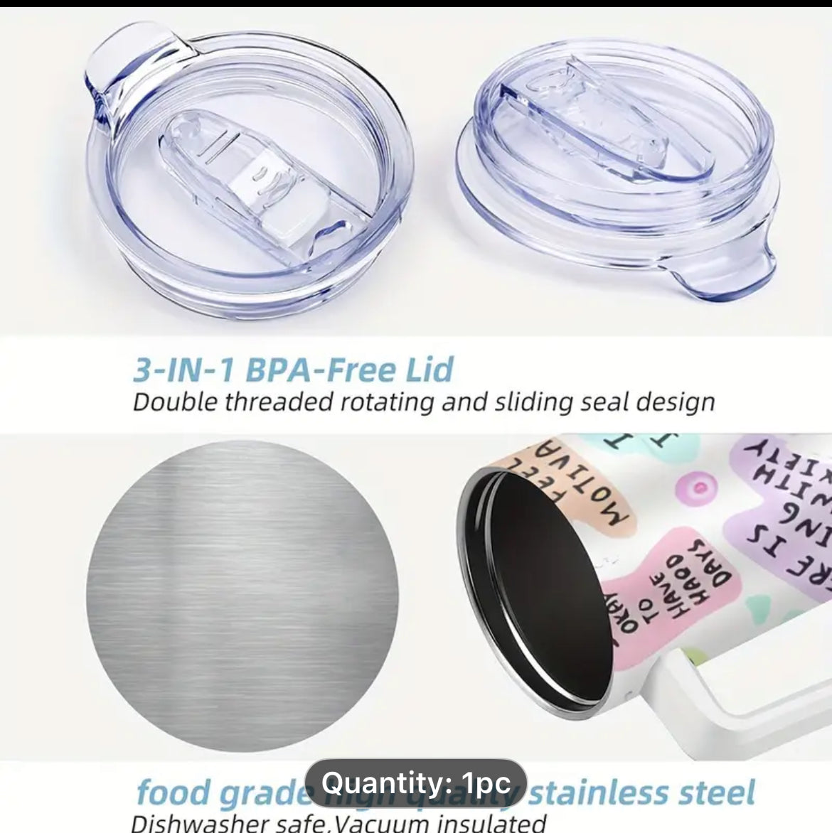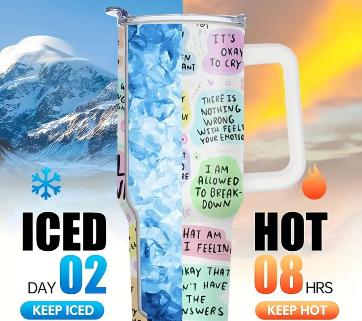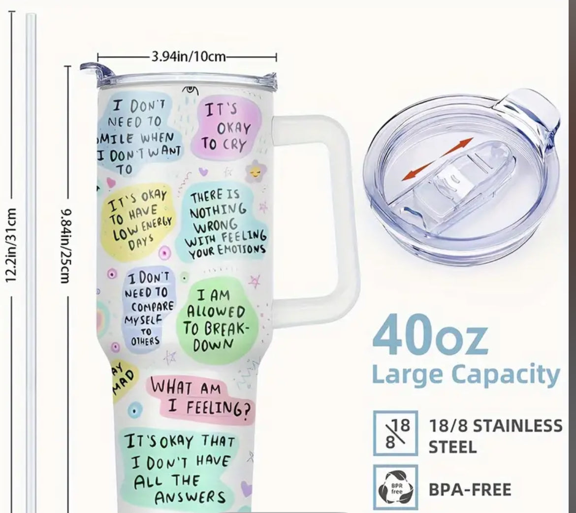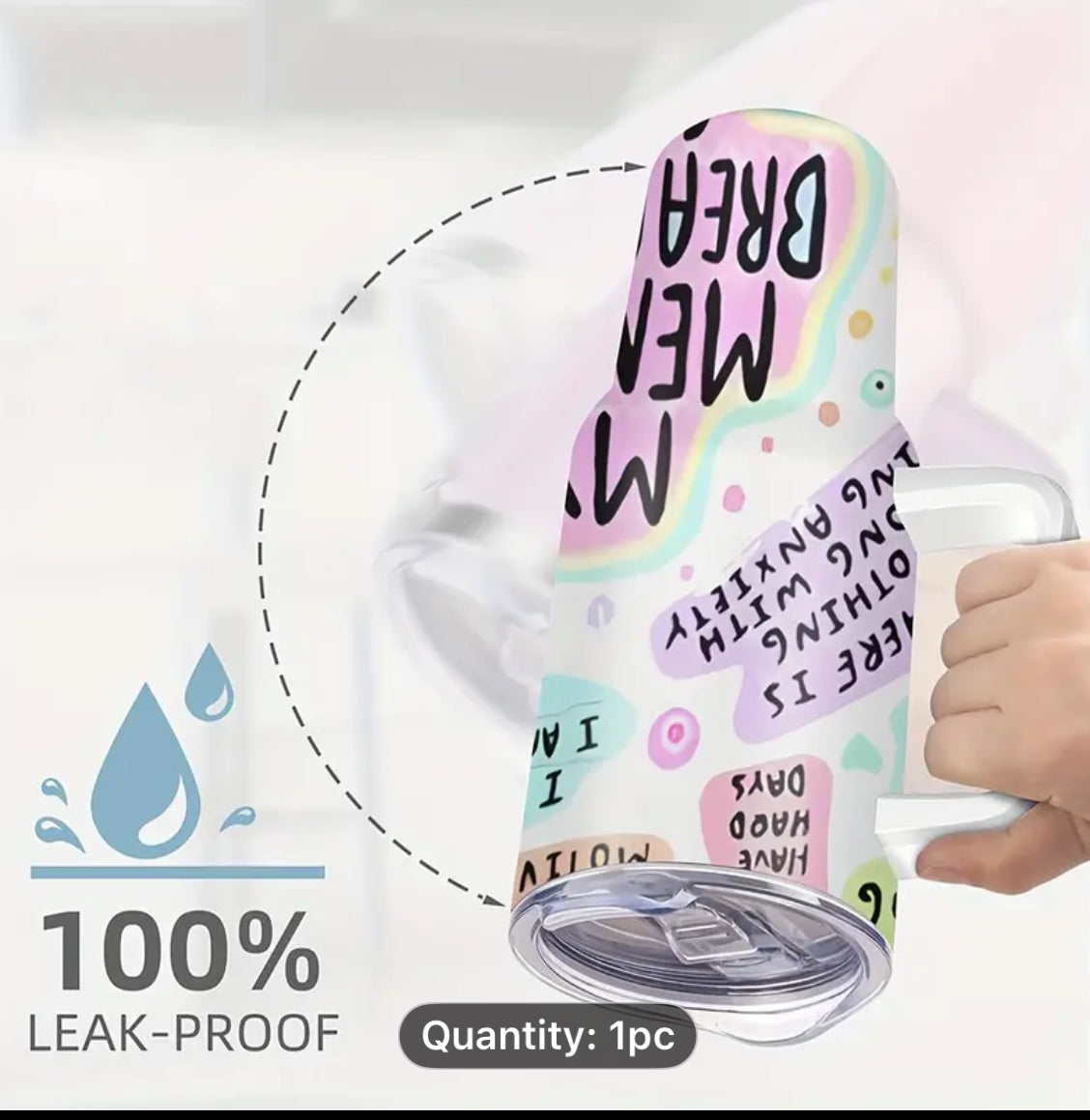 Description: My Mental Breakdown / Tumbler/ 40 ounces/ Random sayings to boost your day and others/ Positive Mental Health Awareness/ It’s okay to feel your emotions/ BPA Free/ Stainless Steel/ Fits in a cup holder/ hot drinks stay hot for 8 hours/ iced drinks stay iced for 2 days