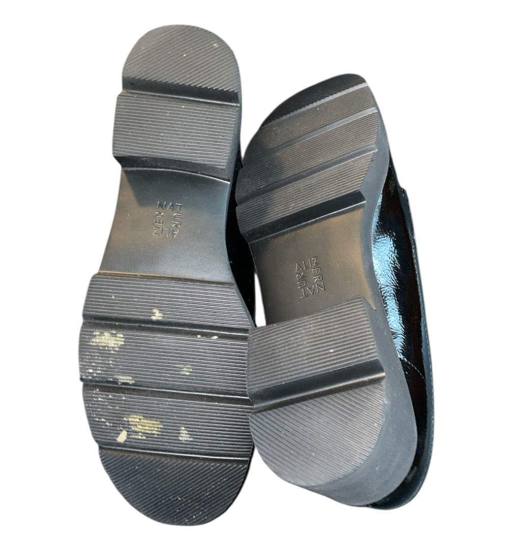 Description: heeled tassel loafer, Naturalizer infinity ornamentation detail/ synthetic upper/ closed round toe/ 3/4 inch platform/ 2 1/4 inch heel/ Contour+ Comfort technology for a premium fit and all-day comfort/ Linings, insole, toe box and heel counter crafted from partially recycled materials/ lightweight EVA sole loafers