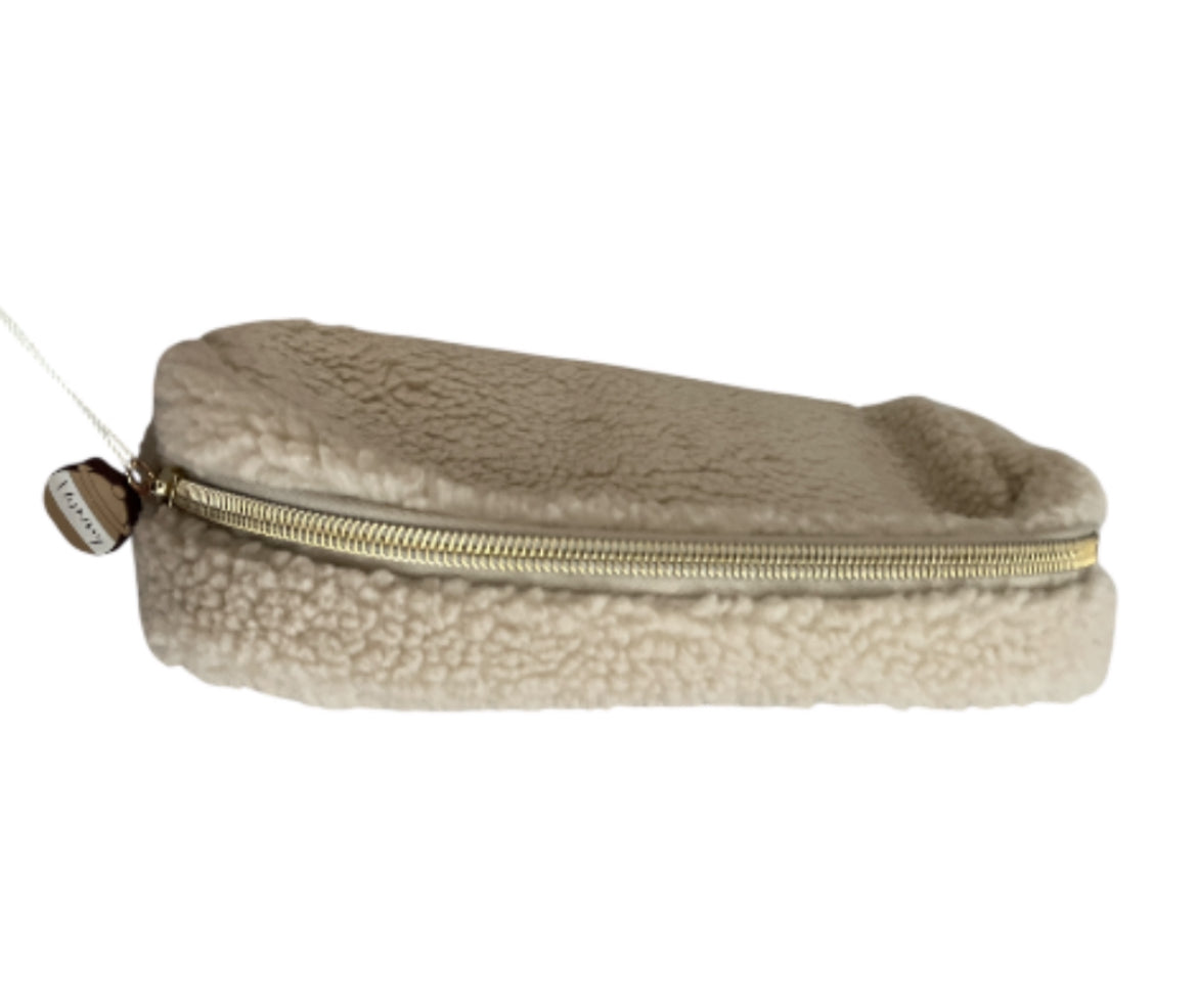 Description: Winnie The Pooh | cosmetic makeup bag | faux sherpa | fleece | Perfect for any fan who loves the beloved character Winnie The Pooh | cream beige exterior | features Pooh, piglet, eeyore and Tigger marching along in embroidered pattern | adorable vintage retro artist style illustration | Zipper closure | Lined interior | Honey pot zipper pull. Gold-tone hardware.
