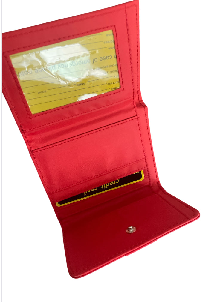 Description: Red Wallet/ Trifold/ Small/ perfect for a small bag or a trip to the pool or beach to toss in a bag/ room for 3-4 cards some cash if desired and a zipper on the back for coins