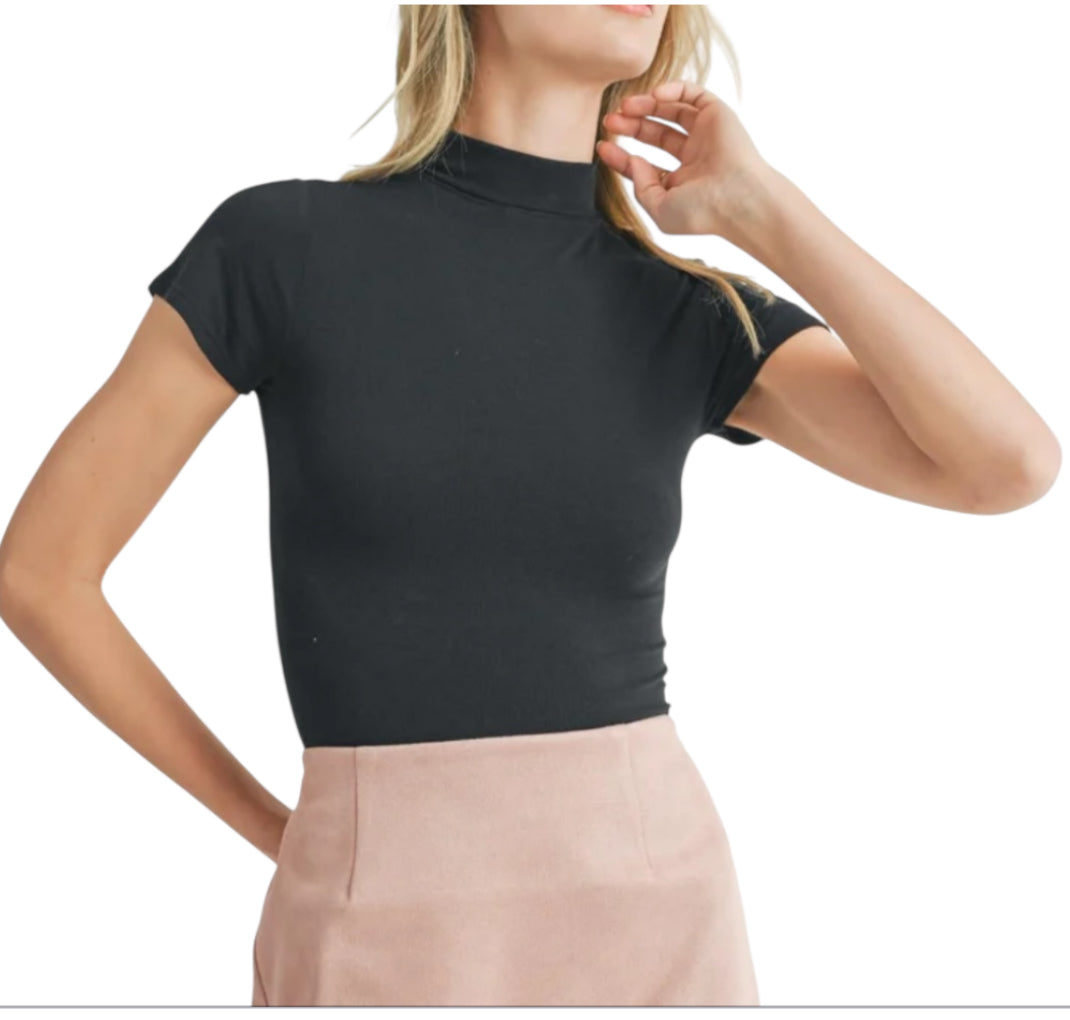Description: black/ short sleeve/ mock neck/ top/ stretchy/ perfect top to wear under a blazer or cardigan/ fitted style/bust approximately 16”
