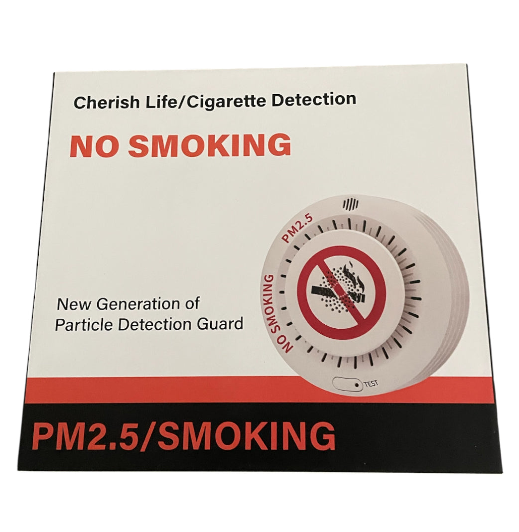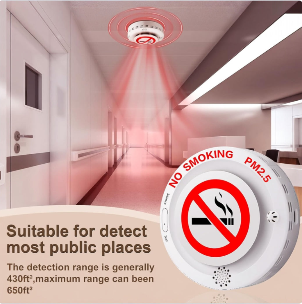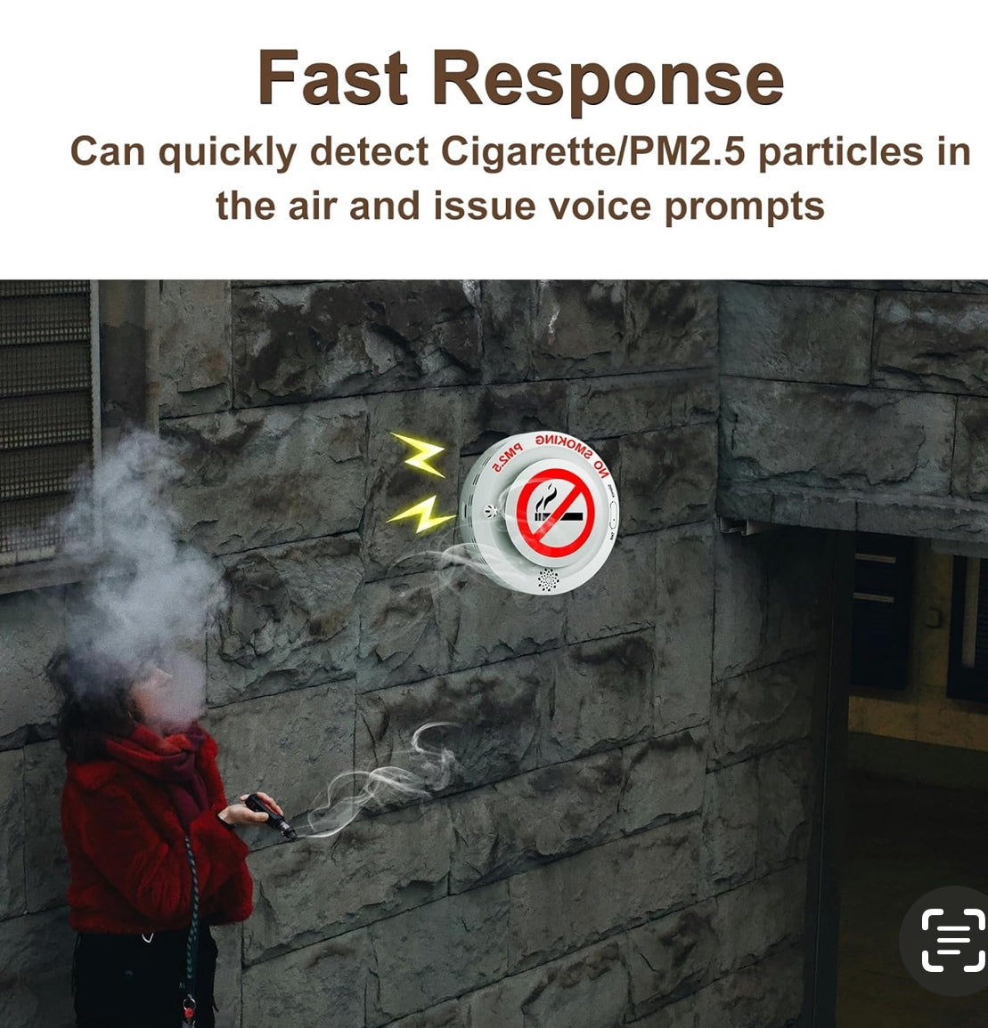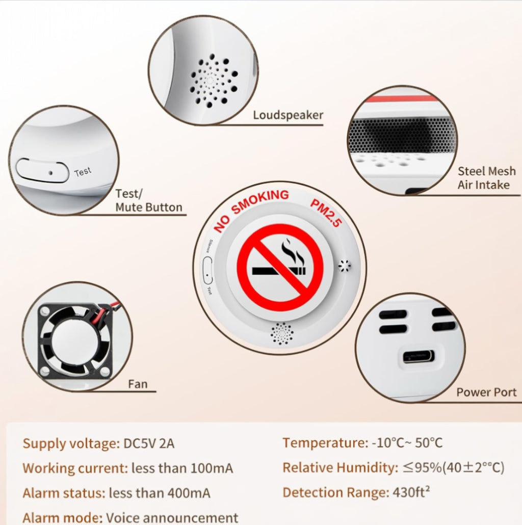 Description: PM2.5 Alarm/ Voice Reminder/ Tobacco Control Guard/ Environmental Monitor for Office/Public Spaces/ Smart Air Quality/ Surveillance System/The PM2.5 Alarm features an intelligent voice reminder system that notifies users in real-time about smoke presence and air quality concerns, enabling prompt action to be taken for a healthier atmosphere.
