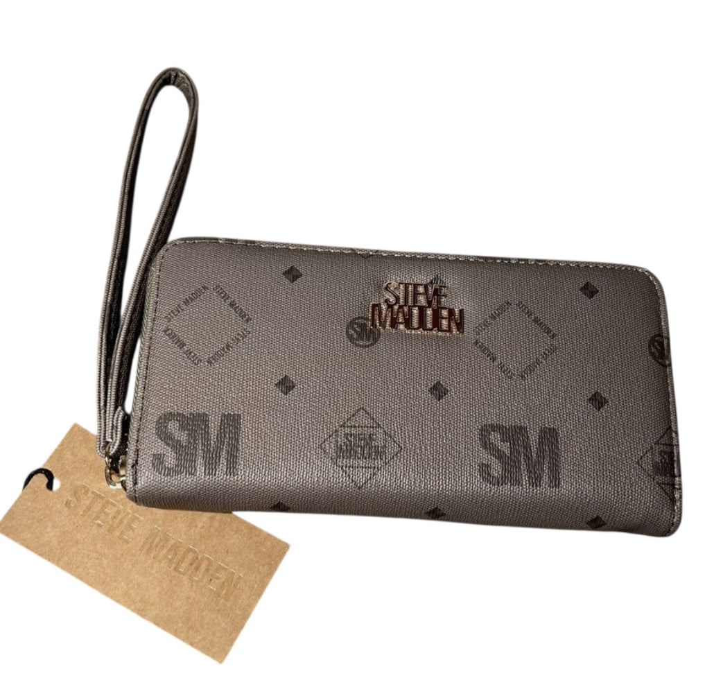 Description: Zip-around wallet with a wristlet strap | Faux leather | Repeating "SM" logo design | Silver-toned logo plate on the front | 12 cc slip pockets | two roomy open sections divided by a zip pocket | pocket area is large enough to hold many cell phones