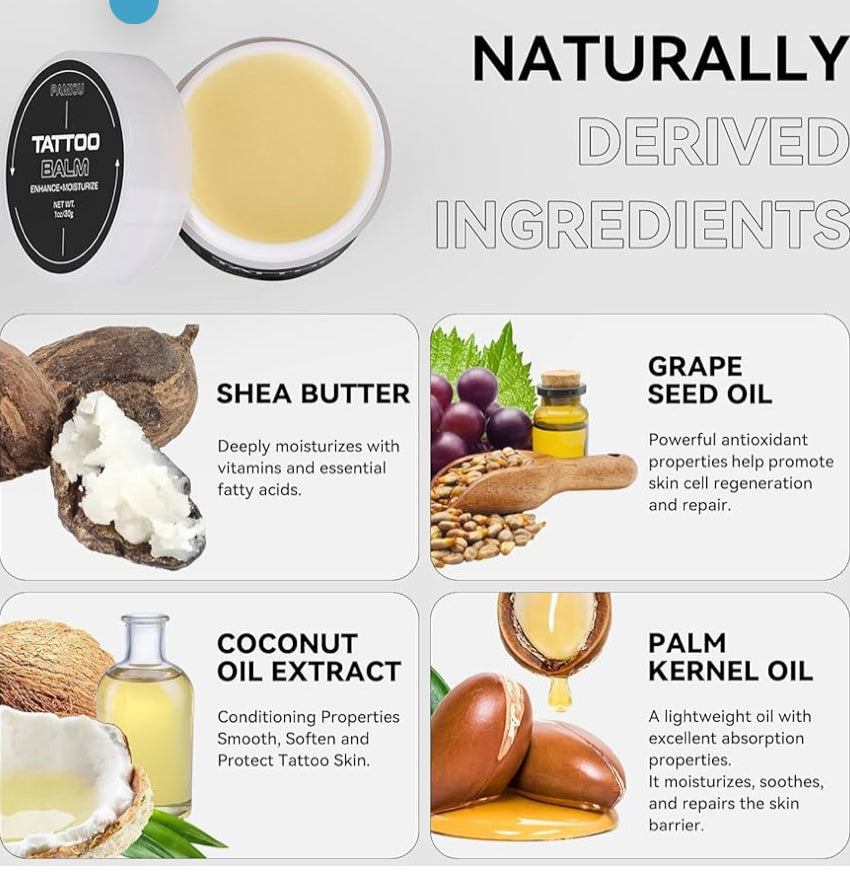 * Tattooed Skin Moisturize & Color Enhance: Pamiou Tattoo Aftercare Balm is enriched with Grape seed oil, shea butter, and coconut extract, providing effective antioxidant and moisturizing properties. These ingredients revitalize and replenish tattooed skin, keeping tattoos vibrant for years.