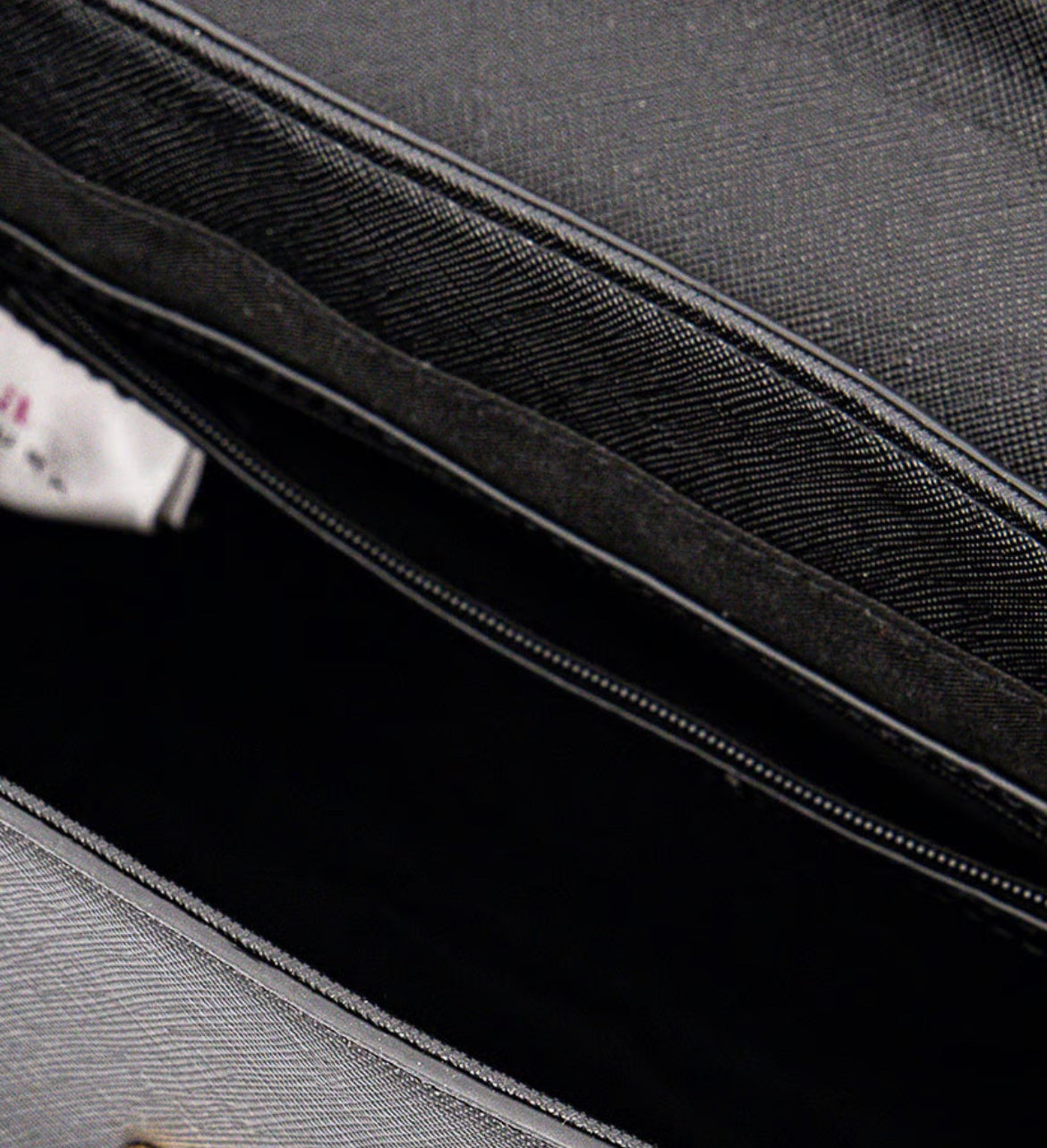 Description: vegan leather/ adjustable removable crossbody strap/ black/ gold tone hardwood/ inner flap pockets/ inner zipper pocket/ flap snap closure