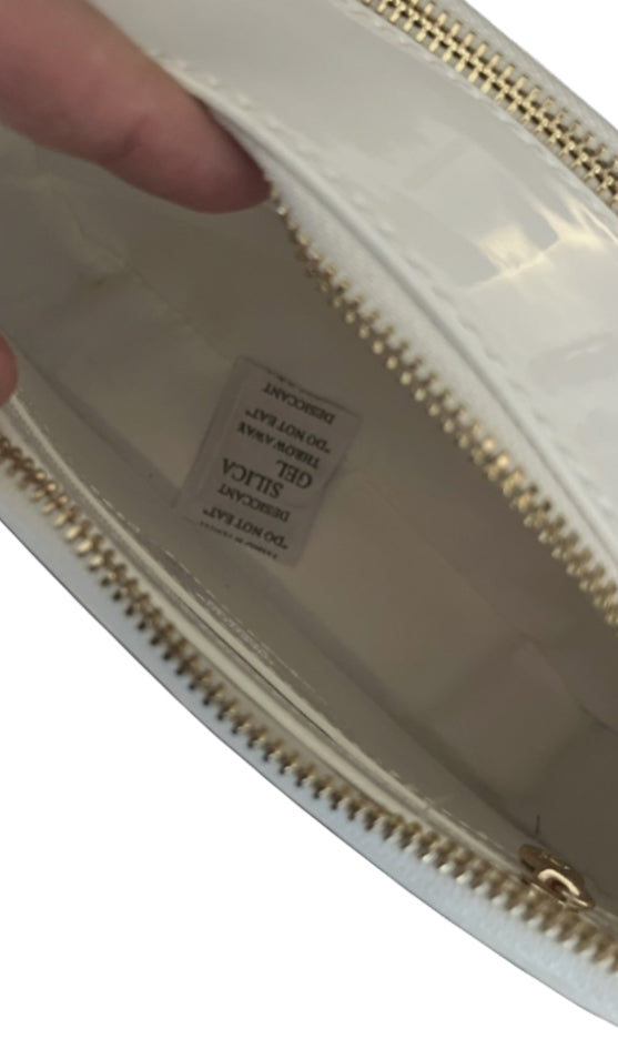Description: thick adjustable strap/ zipper closure/ gold studded detailing on front of bag/ in zipper pocket