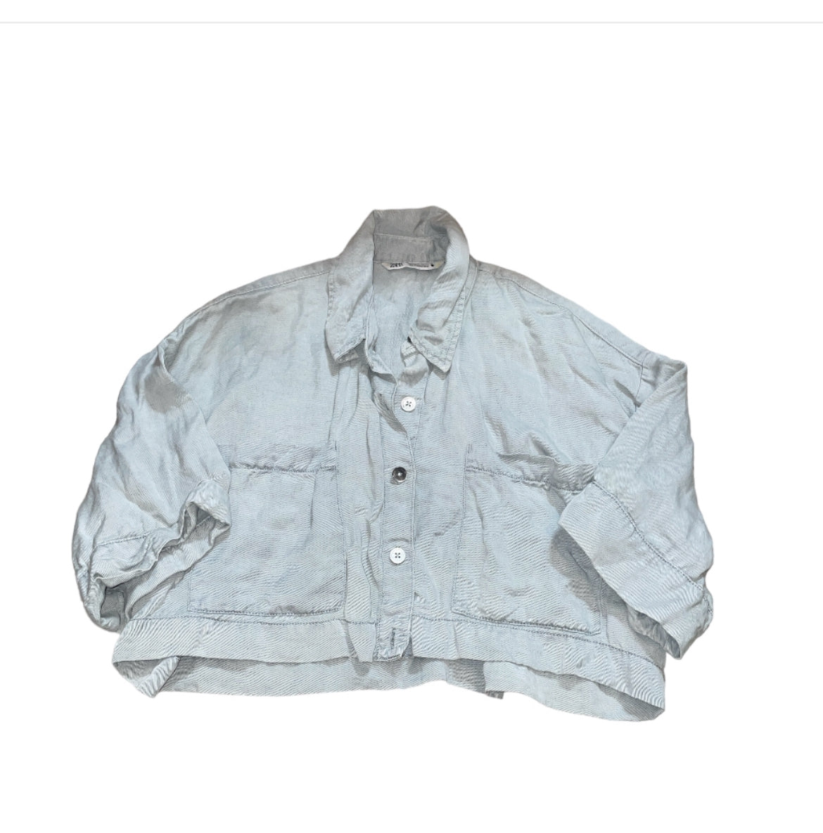 Description: button down/ collar/ 3/4 length sleeves/ oversized/ cropped/ over shirt/ blue gray color/ bust 22”/ length 18”